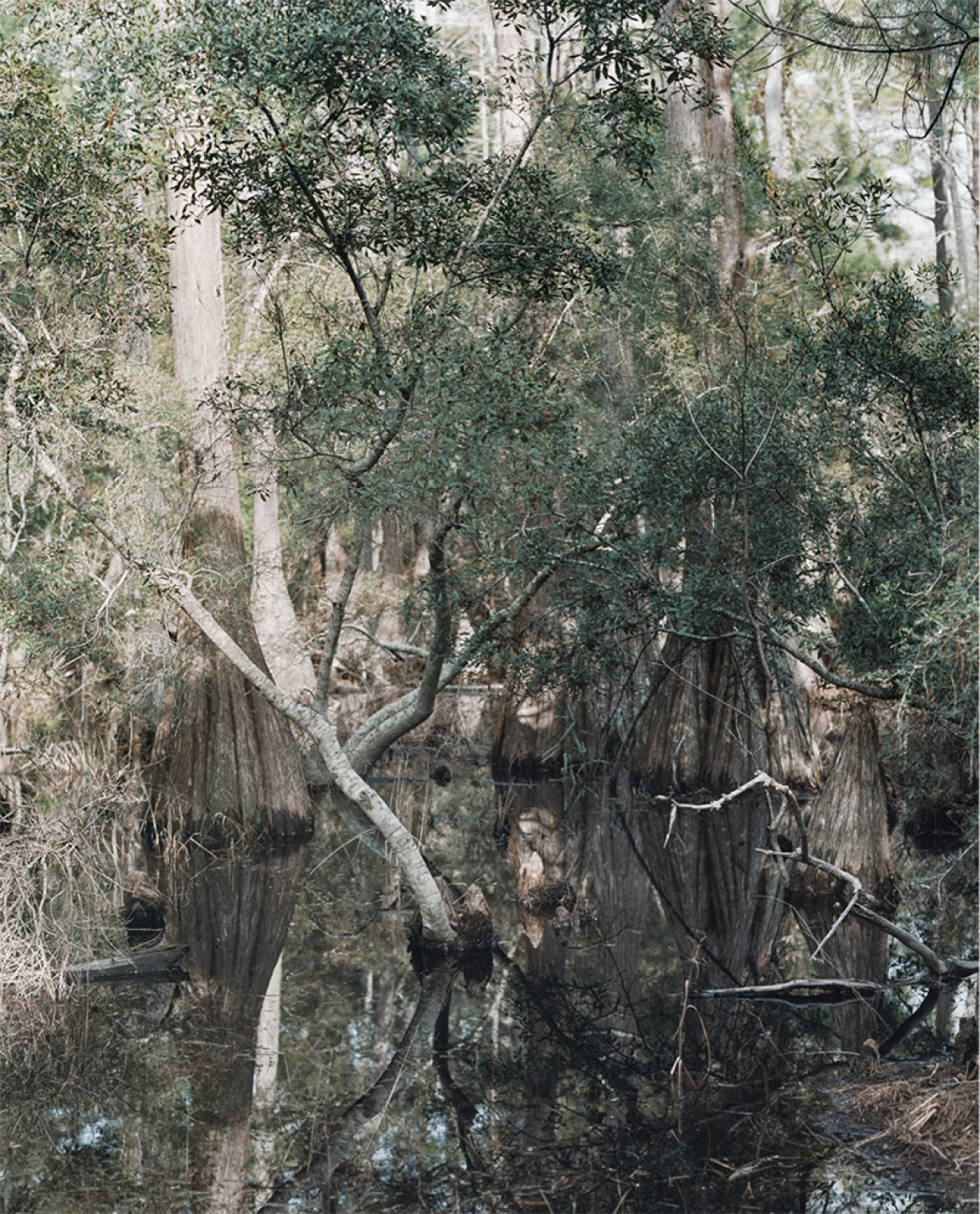In „Delta Horizon“ verzichtet die Photographin auf jegliches Pathos; sie lässt, wenn man so will, der Natur schlichtweg Raum für eine Selbstinszenierung. Mal öffnet sich die Landschaft dem Blick des Betrachters, mal ist dieser verstellt, als befänden wir uns selbst, gleichsam auf den Spuren der Naturforscher im Gefolge Alexander von Humboldts, inmitten eines undurchdringlichen Dschungels, in dem die Vegetation endlos erscheint. Alleinstehende Bäume bilden formal starke Vertikalen gegen die Horizontale des meist niedrigen Horizonts; Staffelungen erzeugen Raumtiefe. Manche Bäume stehen tief im Wasser, fest verwurzelt im fruchtbaren, sumpfigen Grund des subtropischen Regenwaldes, einige sind voller Laubwerk, andere kahl, wie abgestorben. Der Dualismus von Werden und Vergehen innerhalb eines Bildes oder Zyklus verweist auch auf das grundsätzliche Verrinnen von Zeit. Mal herrscht eine unüberwindliche Distanz in den Aufnahmen, mal eine unmittelbare Nähe zur dargestellten Natur, die ohne jeden Menschen auskommt.